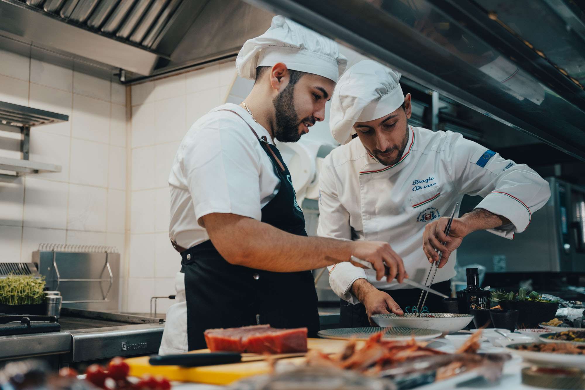 Delight in Mediterranean cuisine based on fresh ingredients, so passionate and creative. The Ristorante "Salotto" is prepared with an elegant atmosphere to offer a generous and exciting taste. linguine with rossi Mazara, tagliata di tonno, antipasti cotti and crudi, specialità di pesce et di carne, pane fragrante et deliziosi dessert di produzione propria. Biagio and Pierluigi Di Caro: bring a plate ready to cook at the moment and present it with fantasia for the gioia of all  senses.